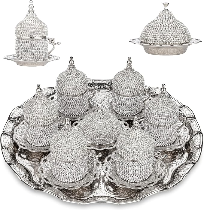 - Multi-Purpose Bowl: The set includes a dome-shaped, crystal-embellished bowl that can be used for serving sugar or Turkish delights along with your coffee.