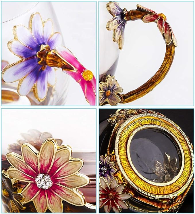 - ELEGANT STYLE&THICK GLASS(3D FLOWER BUTTERFLY DESIGN): The flower and butterfly decorations are vivid and TOP quality,strong adhesive UV glue combined glass and enamel handle into a unique glass mug. such a flower glass coffee mugs cups will leave a deep impression on your guest.