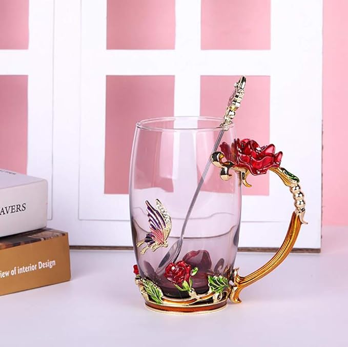 - ELEGANT STYLE&THICK GLASS(3D FLOWER BUTTERFLY DESIGN): The flower and butterfly decorations are vivid and TOP quality,strong adhesive UV glue combined glass and enamel handle into a unique glass mug. such a flower glass coffee mugs cups will leave a deep impression on your guest.