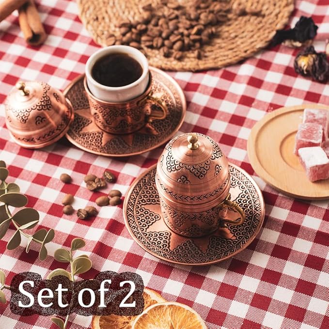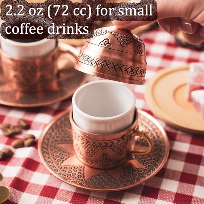 - TOTALLY HANDMADE: The unique decors on this copper cups and saucers are crafted on pure copper by our Turkish artisans carefully to keep the decors for lifelong. It is a heavy and luxury copper cup, so you feel the elegance when you touch it. It comes with 2 saucers, 2 porcelain coffee cups, 2 lid and 2 cup holders as espresso accessories. The ceramic coffee cup is inside 2.2 oz (72 ml). It is standart small espresso and Turkish coffee cup size.