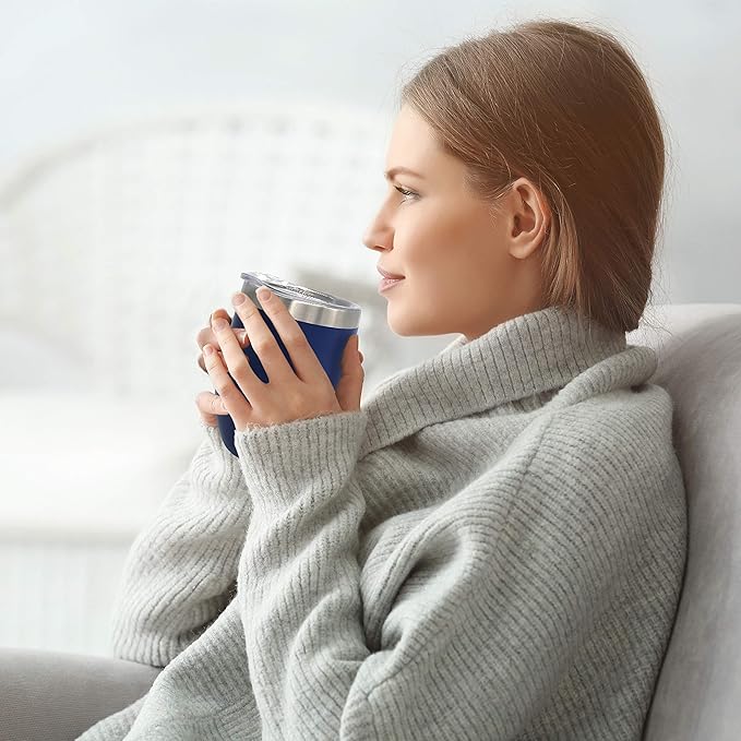 - Keeping coffee hot up to 3 hours is why we love this coffee mug! Our vacuum insulated stainless steel coffee cup is made of 304 Grade - 18/8 stainless steel with a BPA free push-seal lid. No need to worry about burning your hand on the cup. It is cool to the touch! This coffee lover gift includes one blue 12 ounce capacity cup with lid that is best in class & quality, and makes the best coffee gifts for men & women.