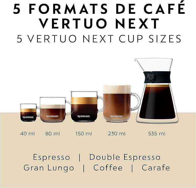 - SIGNATURE COFFEES AND ESPRESSOS: Vertuo Next offers a variety of coffee formats in 6 sizes, including 5, 8, 12, and 18 oz coffees, as well as single and double espressos brewed hot or over ice.