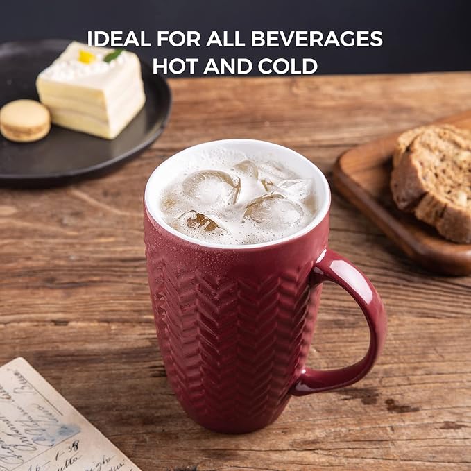 AmorArc Extra Large Coffee Mugs Set of 6, 20oz Ceramic Tall Coffee Mugs with Textured Geometric Patterns for Latte/Tea/Beer/Hot Cocoa, Dishwasher & Microwave Safe, Burgundy