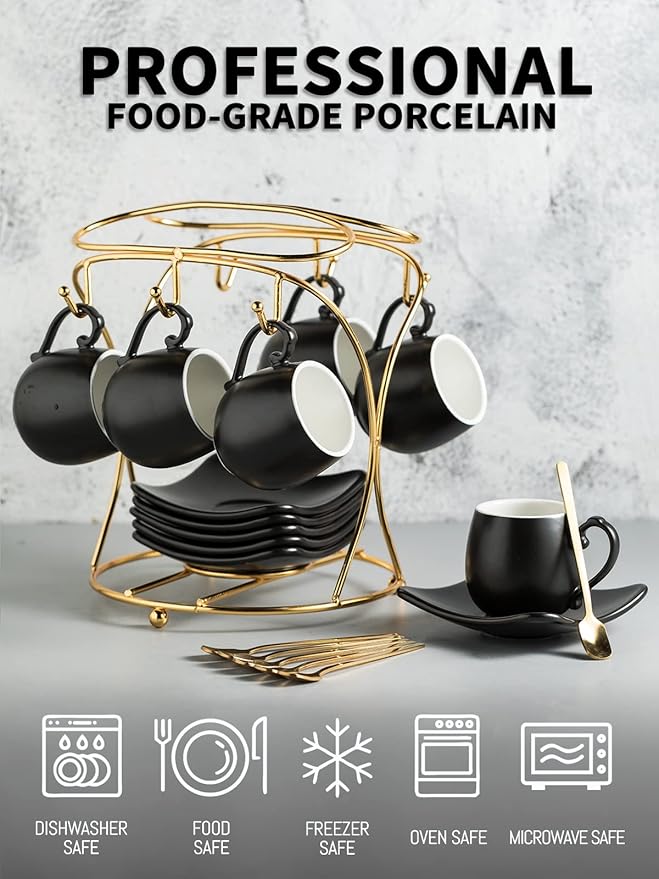 - Suitable for Gifting: This coffee cup and saucer set features a classic matte black and gold design and come with gold spoons to add a touch of grandeur to the set. The stylish design is perfect for your kitchen decor or a fine addition to your home espresso bar.
