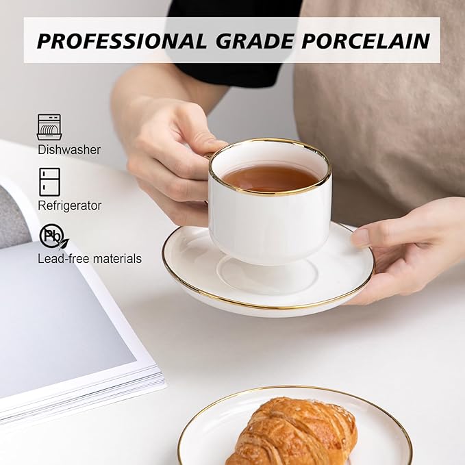Tea Cups and Saucers with Gold Trim, 6.76 Ounce White Porcelain Tea Set & Coffee Cups for Latte, Cafe Mocha, Tea-Set of 4,Porcelain Mugs for Kitchen or Cafe(white and gold)