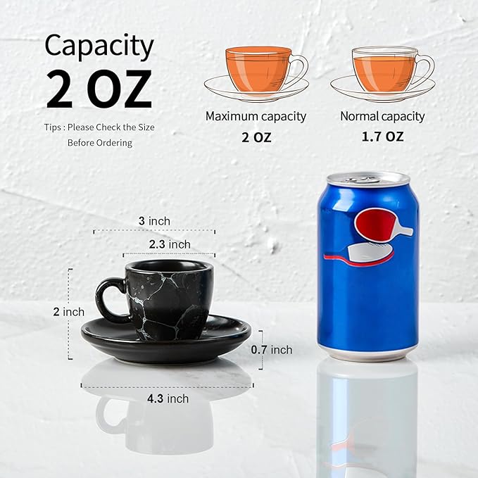 - 【Caffee Mania Daily use】These demitasse cups are the correct size works great with an espresso machine. Each espresso shot cup holds 2 oz(Max. Capacity). set of 6, each sleek cups measures at 2.3" in Dia and 2" in height, saucer plates measure at 4.3" in Dia, perfect for specialty coffee drinks, espresso..