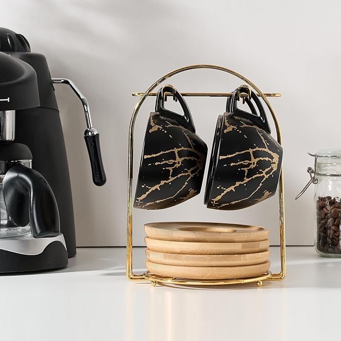 LUKA Ceramic Demitasse Espresso Cups Set with Saucers and Metal Stand, 8 oz Porcelain Stackable Cappuccino Cups Teacup For Tea, Espresso, Latte, Coffee, Cafe Mocha, Set of 4, Black