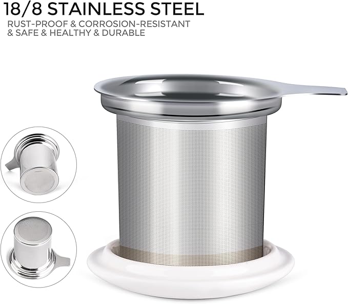 - STAINLESS TEA INFUSER: GBHOME stylish tea cup with a deep stainless infuser and it has enough room to expand the larger leaf teas like oolong. Instead of using chemical plating, we use 304 stainless steel which is zero chemicals in the tea steeping process. The infuser is also deep enough and the materials are food-grade, beautiful, and lightweight. It can be held on the lid when you are finished steeping.