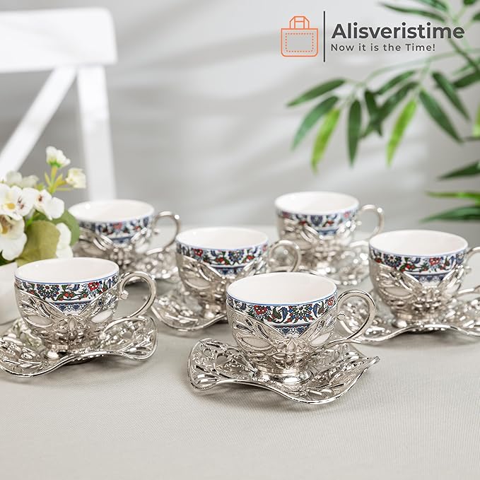 Alisveristime Turkish Coffee Set for Six, 6 Topkapi Design Porcelain Cups with Zamac Holders and Saucers, Two Color Variations: Gold and Silver (Topkapi-Design) (Silver)