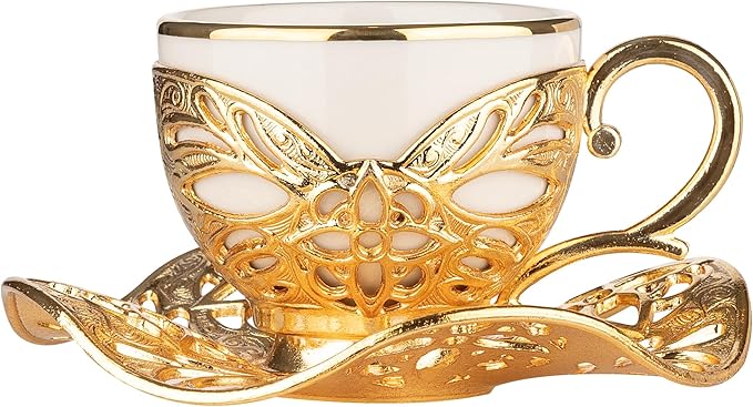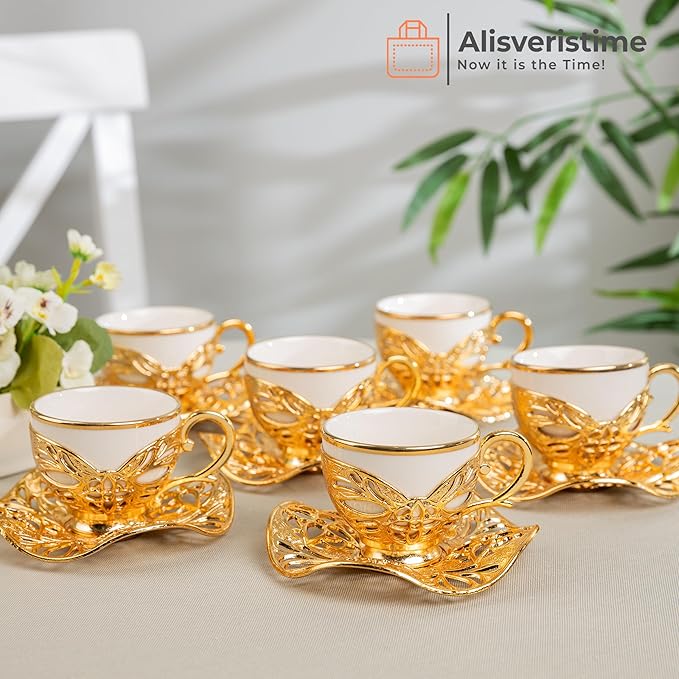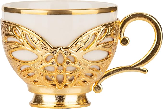 Alisveristime Turkish Coffee Set for Six, 6 White Porcelain Cups with Gilded, Zamac Holders and Saucers, Two Color Variations: Gold and Silver (Gilded-Design) (Gold)