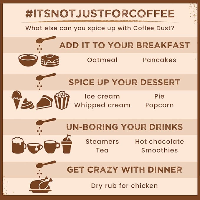 - WHY BUY COFFEE DUST? – Highly rated by customers; all natural ingredients, healthy coffe flavoring alternative, eco-friendly packaging, unique flavors, and perfect as a coffee gift sampler or daily coffee treat.