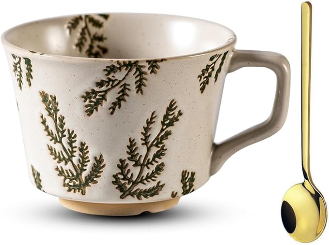 Coffee Mug 4 with Gold Spoon, 11 oz Porcelain Mug, Ancient Style Hand-painted Mug for Men Women, Dishwasher Microwave Safe W006-Green Leaf