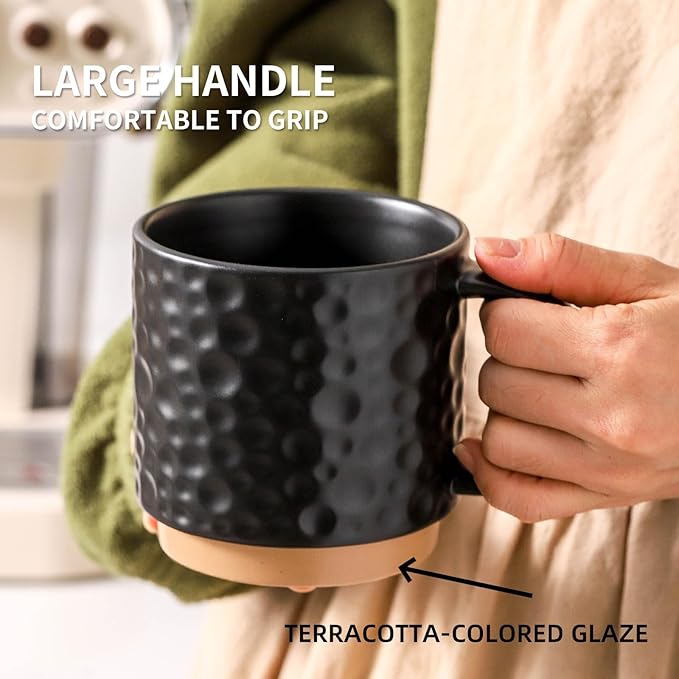 - 【DESIGN】The stackable feature allows for convenient storage and organization in your kitchen cabinet or pantry, saving space and keeping your mugs easily accessible.a beautiful embossed texture design,a large handle that fits the feel,the smooth rim ensures a comfortable drinking experience.