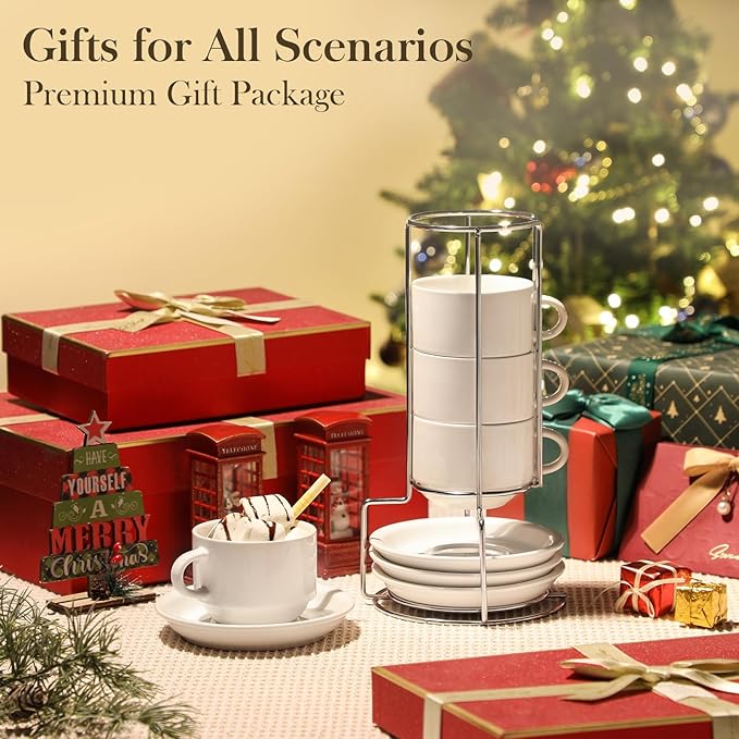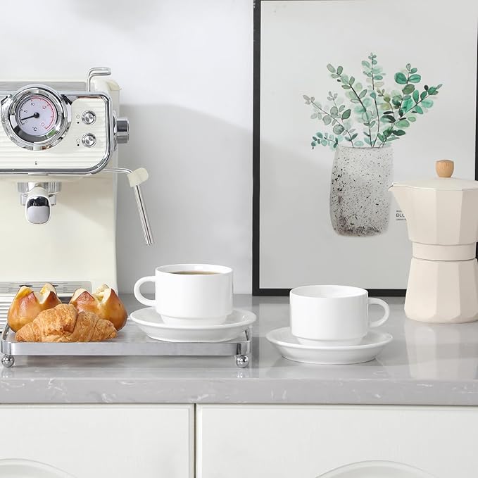 - 【STACKABLE & SPACE SAVING】The stackable Cappuccino Cups and compact metal stand maximize storage efficiency, making this set perfect for kitchens, coffee bars, or limited counter spaces. The stackable design keeps your kitchen tidy and clutter-free, while the metal stand provides a sleek and modern way to display your cups and saucers.
