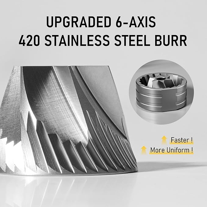- [2025 UPGRADED VERSION] STARESSO D6 PLUS Coffee Grinder upgraded with 6-Axis CNC burr and all-metal body. Crafted from high-quality 420 Stainless Steel conical burr, it ensures uniform grinding and consistent grounds for every brew, delivering unparalleled flavor with dual bearing precision.