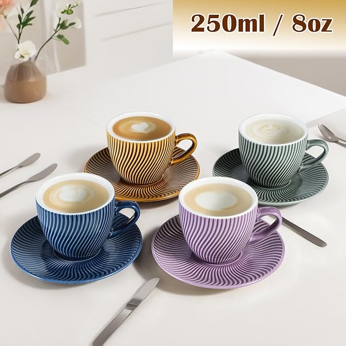 Yundu 8 oz Ceramics Cup & Saucer Sets of 4, Cappuccino Cup, Espresso Cups, Tea Cups and Saucers, Perfect for Coffee or Matcha and Latte (Set of 4 colors)