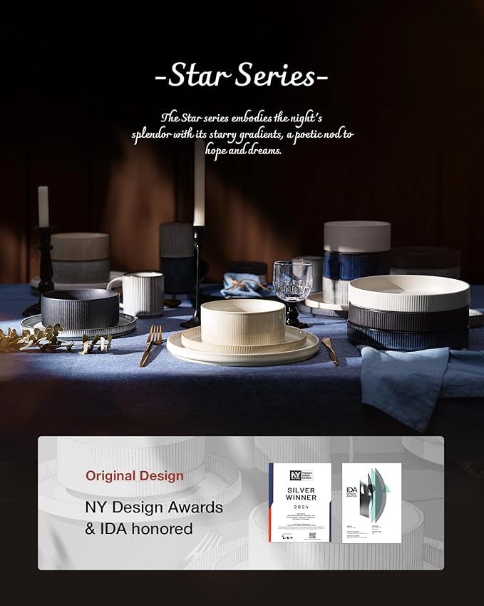 - STACKABLE: Appreciating the vertical-edge design, we've also addressed the stacking dilemma. Our dinnerware features grooves on the underside for easy, stable stacking