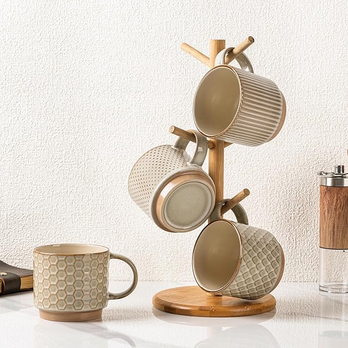 - Stackable and Modern Design: These ceramic mugs feature a beautiful embossed texture design, the smooth rim ensures a comfortable drinking experience, the stackable design allows for easy storage and helps save space in your kitchen.