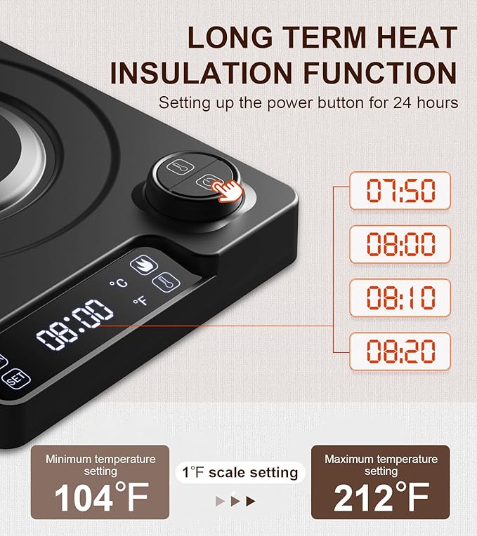 - 【24-Hour Keep Warm Feature】: The electric kettle supports constant temperature maintenance for 1 to 24 hours. Simply press the "KEEP WARM" button before bed and set the desired keep warm duration using the rotary adjustment button. Enjoy delicious coffee first thing in the morning.