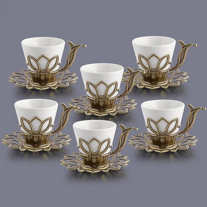 Alisveristime (Set of 6 Turkish Coffee Set with Porcelain Cups, Zamac Holders & Saucers – 80ml Capacity, Ottoman Motif, 4 Color Options (Antique Green)