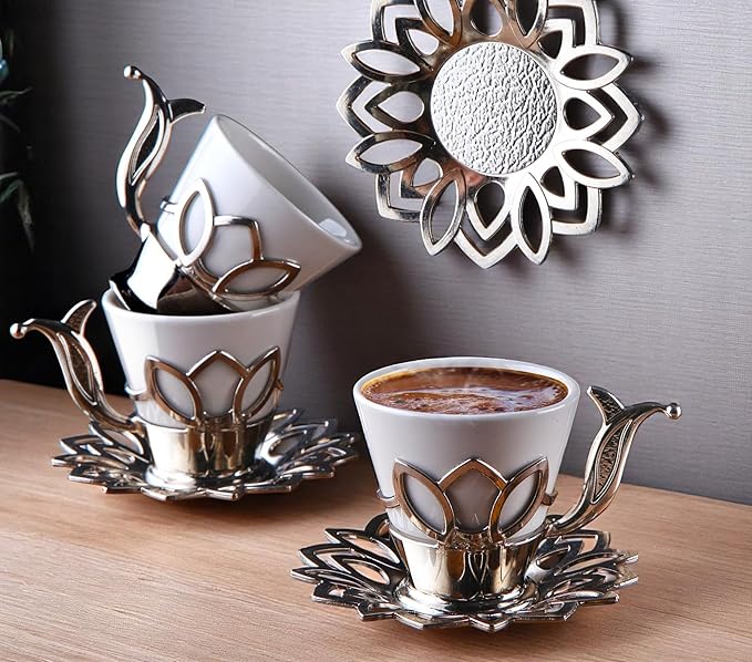 Alisveristime (Set of 6 Turkish Coffee Set with Porcelain Cups, Zamac Holders & Saucers – 80ml Capacity, Ottoman Motif, 4 Color Options (Silver)