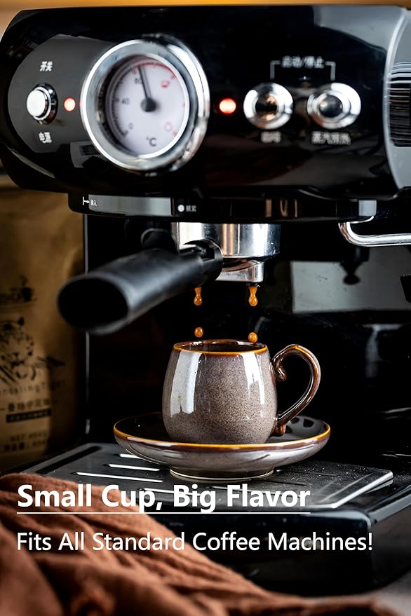 - Farmhouse-Inspired 3oz Espresso Set: Includes 6 ceramic brown espresso cups (3oz), round matching saucers, 6 spoons, and a rustic metal stand—perfect for creating a cozy, vintage-inspired coffee nook. Ideal for espresso shots, small cappuccinos, or even Cuban coffee