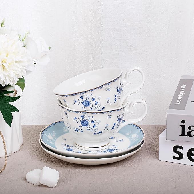 fanquare 5 Ounces Blue Rose Tea Cup Set of 6, Gold Trimmed Porcelain Coffee Cups for Party Home, Vintage British Afternoon Cup and Saucers