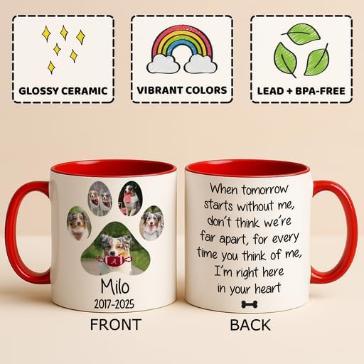 - Custom Collage Memorial Mug: Upload multiple photos of your dog to be printed in a paw-shaped collage with name and life years.
