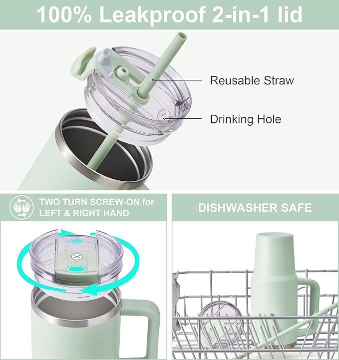 - BPA Free Leak Resistant Lid & Reusable PP Straw: Screw-on lid to prevent leaks and spills, wide mouth opening for large ice cubes and easy cleaning