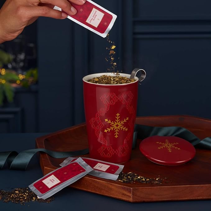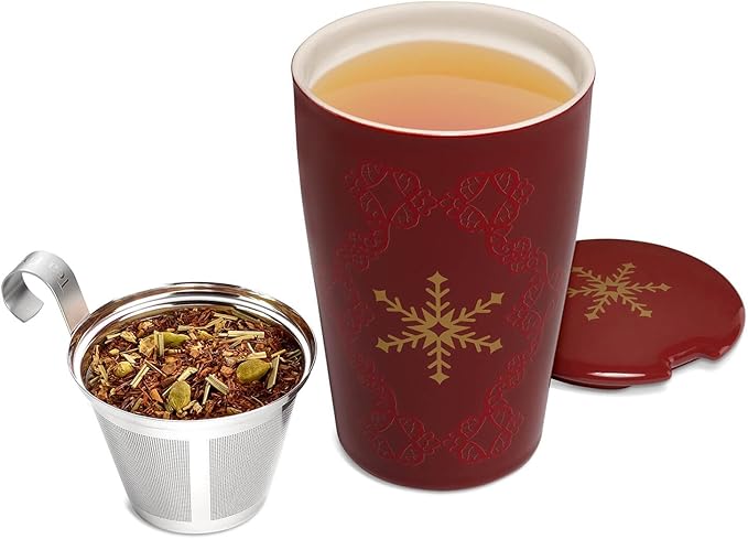 - TEA CUP WITH INFUSER (HOLIDAY EDITION) includes a double-wall ceramic tumbler, stainless steel loose leaf tea infuser basket and a lid