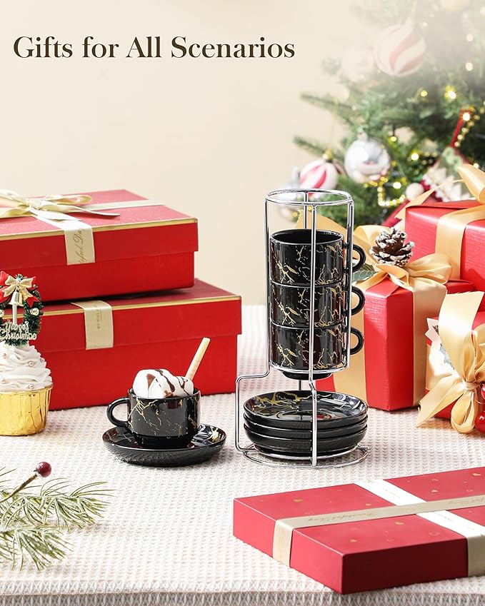 MALACASA 2.5 OZ Porcelain Espresso Cups with Saucers and Metal Stand Set of 4, Stackable Cappuccino Cups, Marble Black Expresso Shots Cup Set for Coffee Drinks, Latte, Tea
