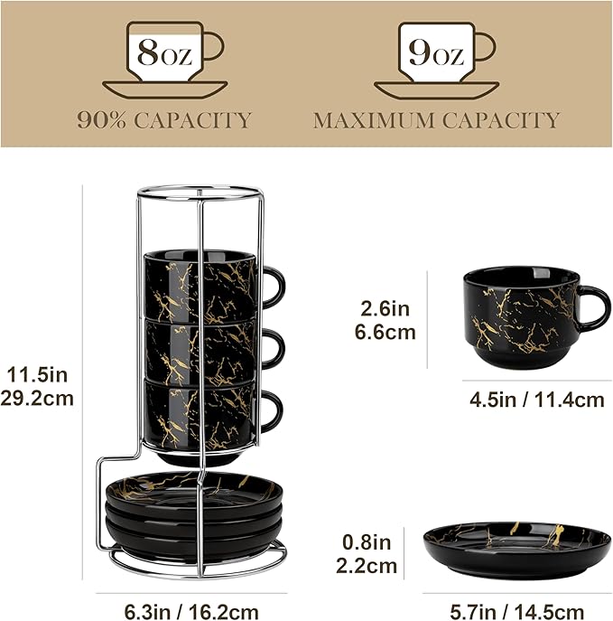 - 【STACKABLE & SPACE SAVING】The stackable Cappuccino Cups and compact metal stand maximize storage efficiency, making this set perfect for kitchens, coffee bars, or limited counter spaces. The stackable design keeps your kitchen tidy and clutter-free, while the metal stand provides a sleek and modern way to display your cups and saucers.
