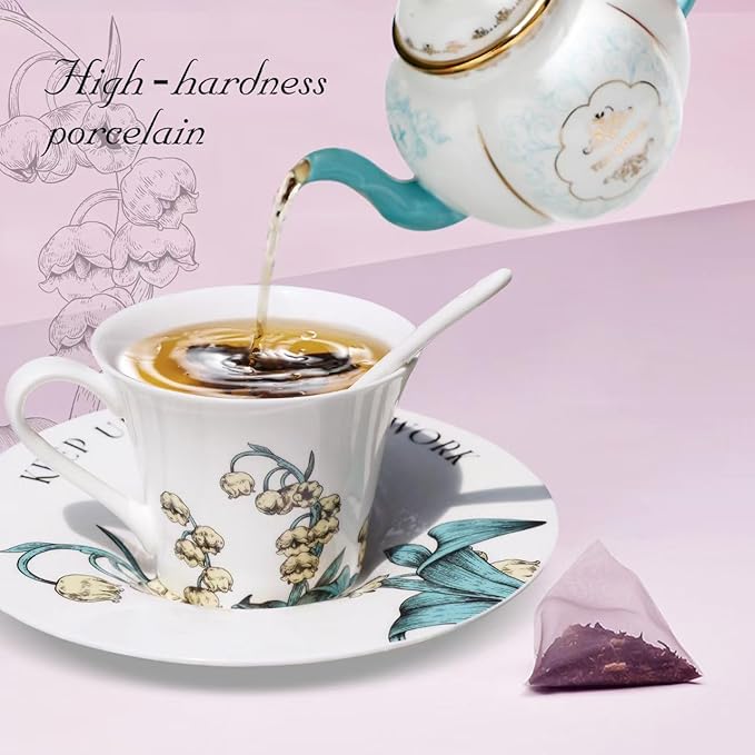 - Unique and creative design: The designer uses the lily of the valley flower pattern design, which means the return of happiness, the tea cups pattern is exquisite, each cup has a capacity of 7 ounces, with a spoon, easily stirred, and enjoy a leisurely time.