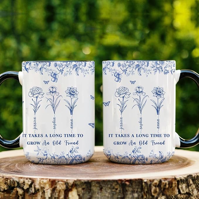 - Design Meaning: This floral mug design features the quote, "It takes a long time to grow an old friend," symbolizing the lasting nature of true friendship. The beautiful Chinoiserie and Toile de Jouy patterns make it an ideal gift for any special occasion.