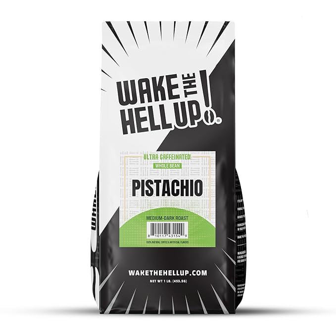 Wake The Hell Up! 1lb Ultra-Caffeinated Pistachio Whole Bean Coffee, Low Acid, Medium-Dark Roast
