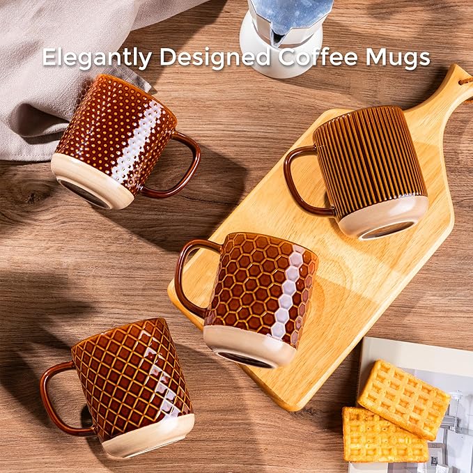 - Modern Design With Large Handle: These coffee mugs features a large handle that provides a comfortable and secure grip. The handle remains cool even after microwaving, and the beverages stay warm. they are also feature a beautiful embossed texture design, the smooth rim ensures a comfortable drinking experience