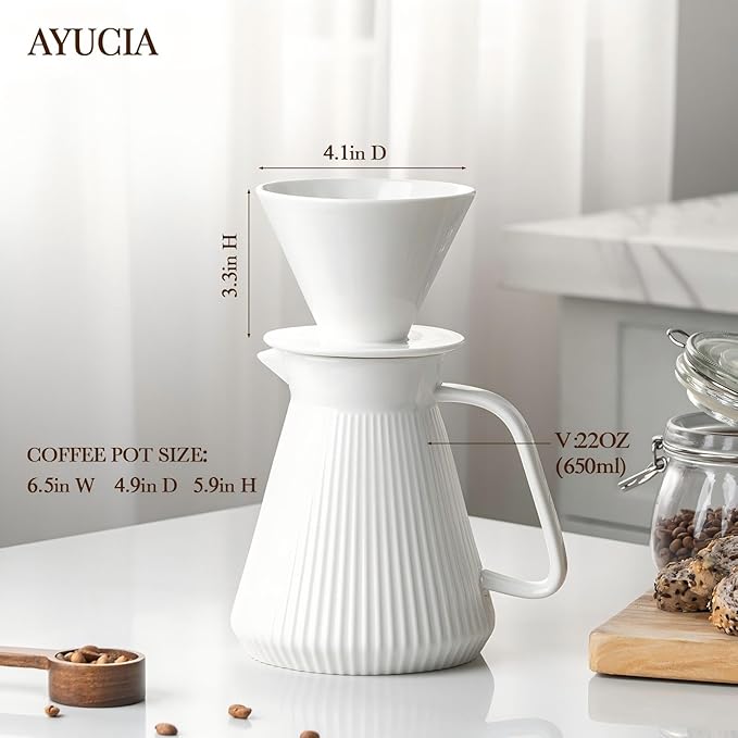 - Modern Simple Design: Our pour over coffee maker set with its pure white cream color and modern design will surely add a charm to your kitchen countertops or coffee bars.The normal capacity of the coffee pot is 22 Ounces(max capacity:27oz), and it can be brewed and serve up to 4 cups of coffee, perfect for 3-4 people.
