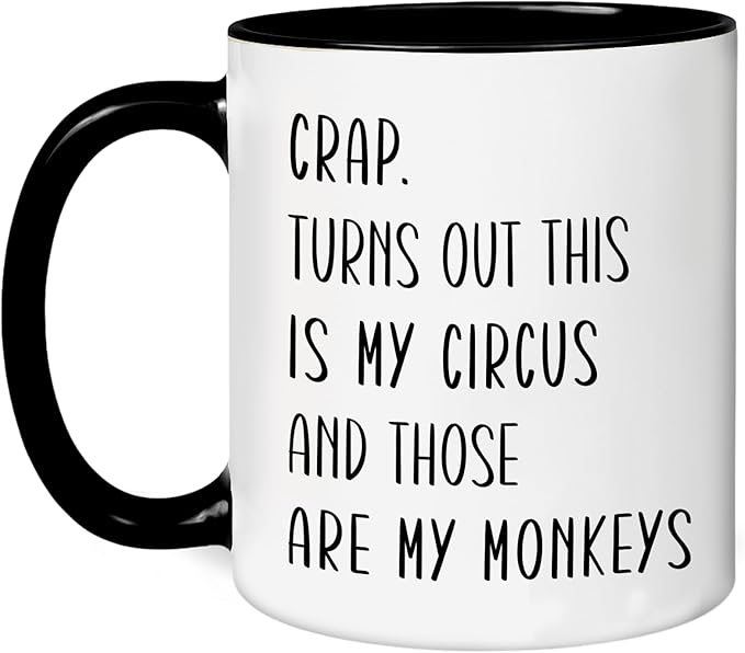 - HILARIOUS DESIGN – Printed with the funny phrase “Crap. Turns out this is my circus and those are my monkeys,” this mug adds humor to any morning routine. Its lighthearted tone makes it the perfect gift for coworkers, friends, or family members who appreciate a good laugh while sipping their coffee or tea.