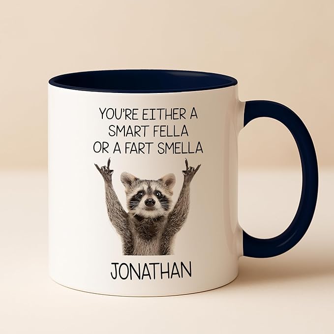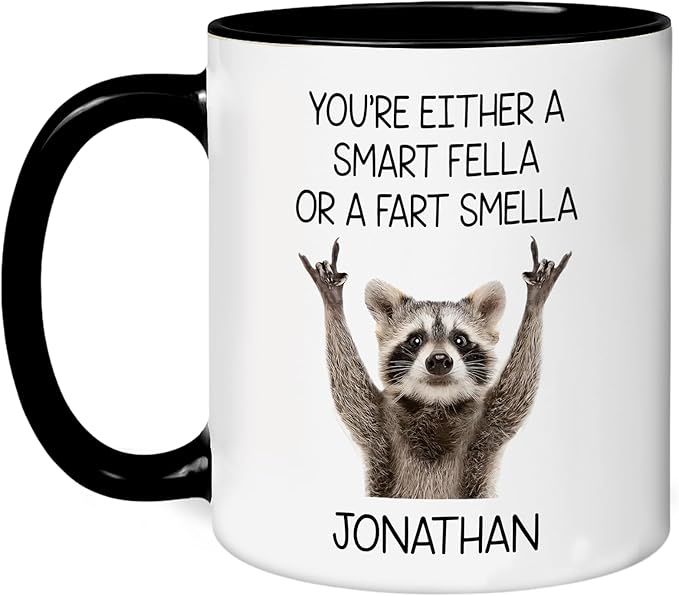 Personalized Funny Raccoon Coffee Mug – Custom Name Cup with Quote “You’re Either a Smart Fella or a Fart Smella” – Unique Gag Gift, White Elephant Christmas Cup