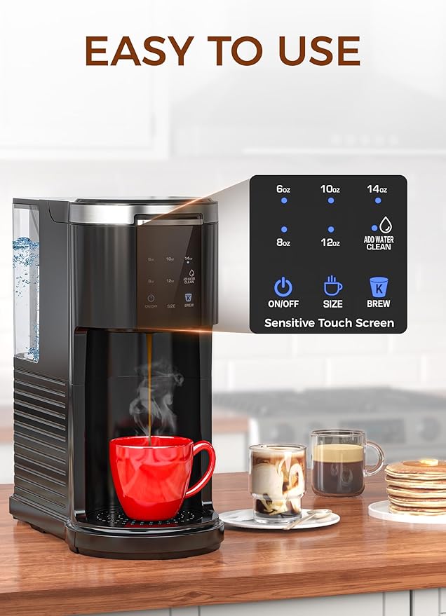 - User-Friendly Touchscreen: The intuitive touchscreen interface makes operation of this single serve coffee maker simple and smooth, while offering 5 brew size options to customize your coffee experience effortlessly.